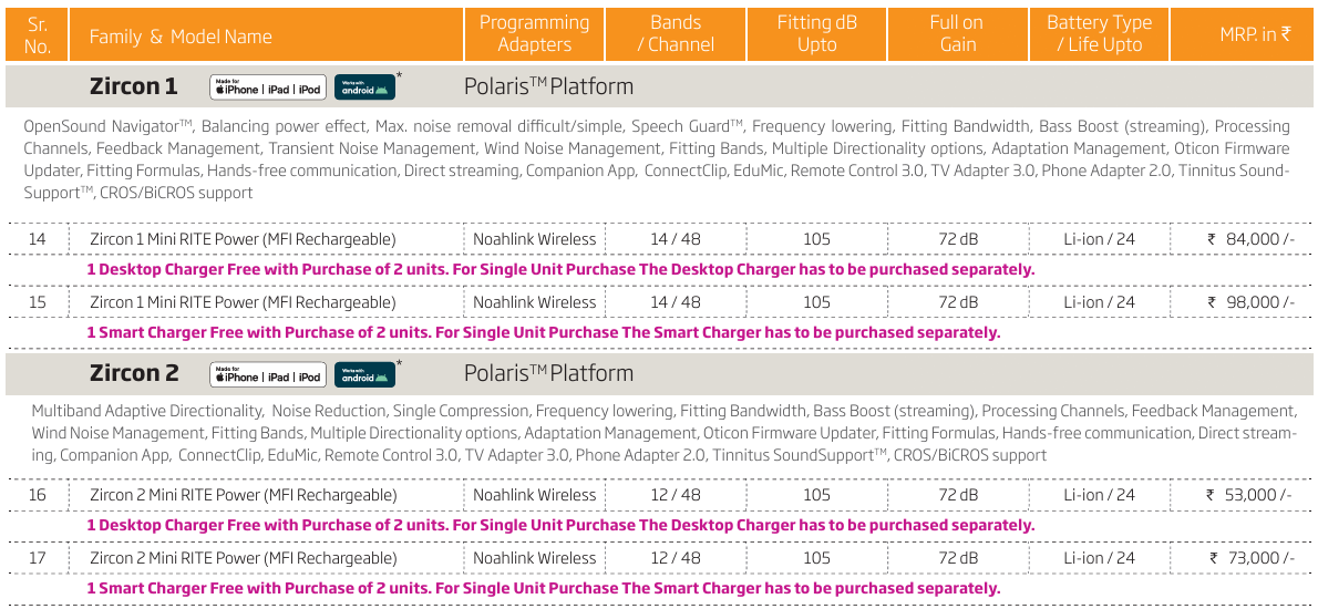14 Zircon 1 Mini RITE Power (MFI Rechargeable) 14 / 48 105 dB 72 dB Li-ion / 24 hrs ₹ 84,000/-